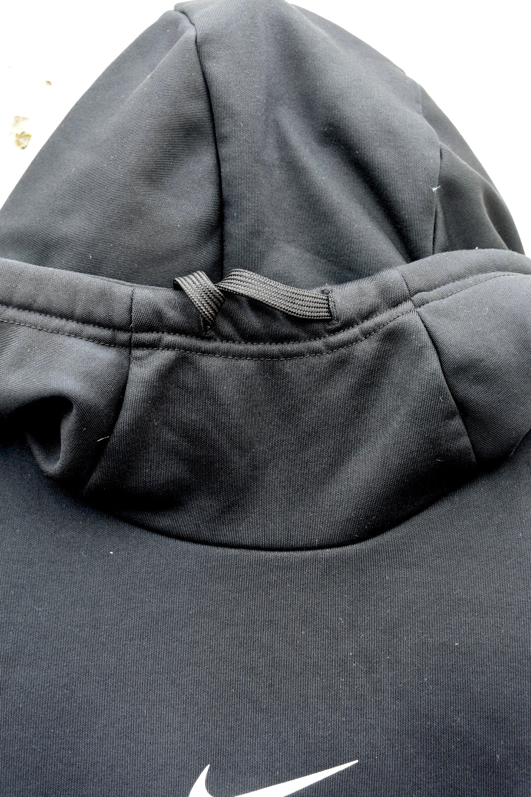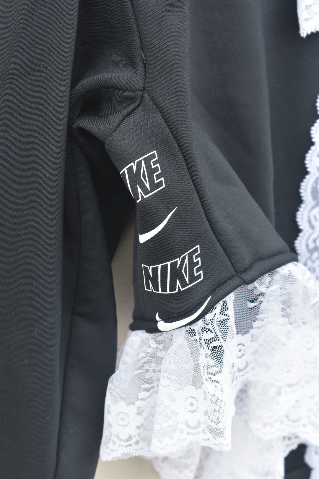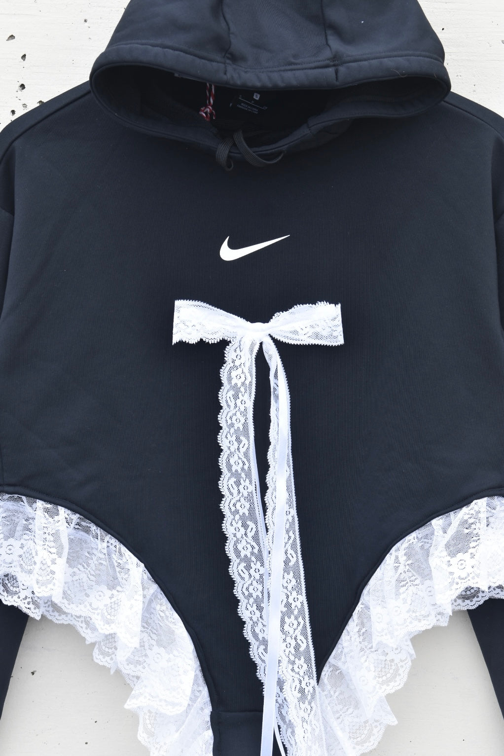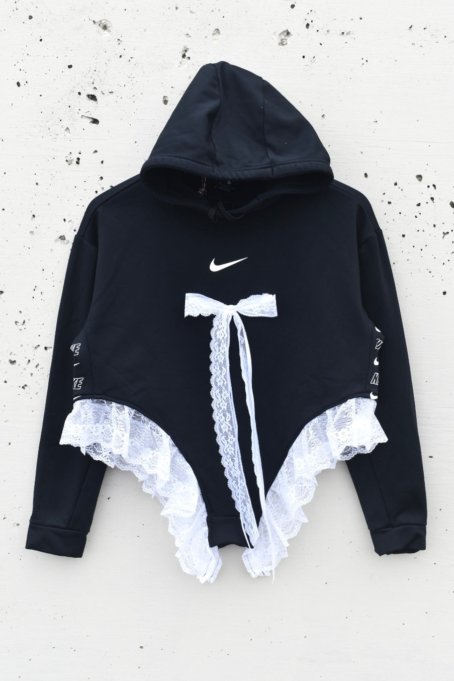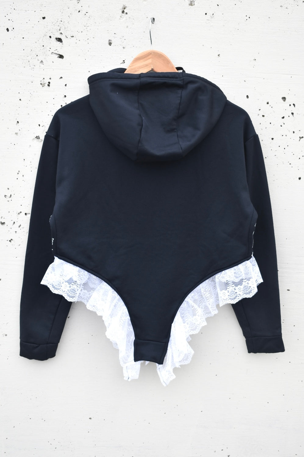 Black and white reworked/upcycled cropped lace hoodie with high neckline