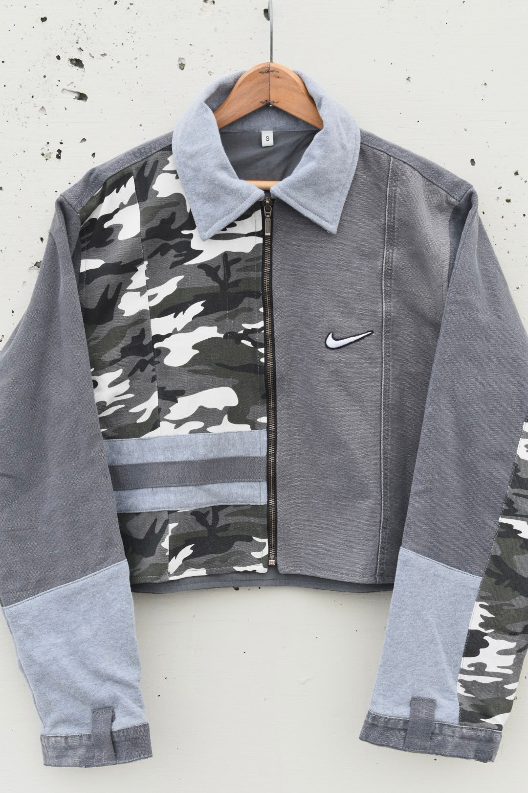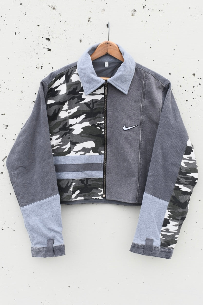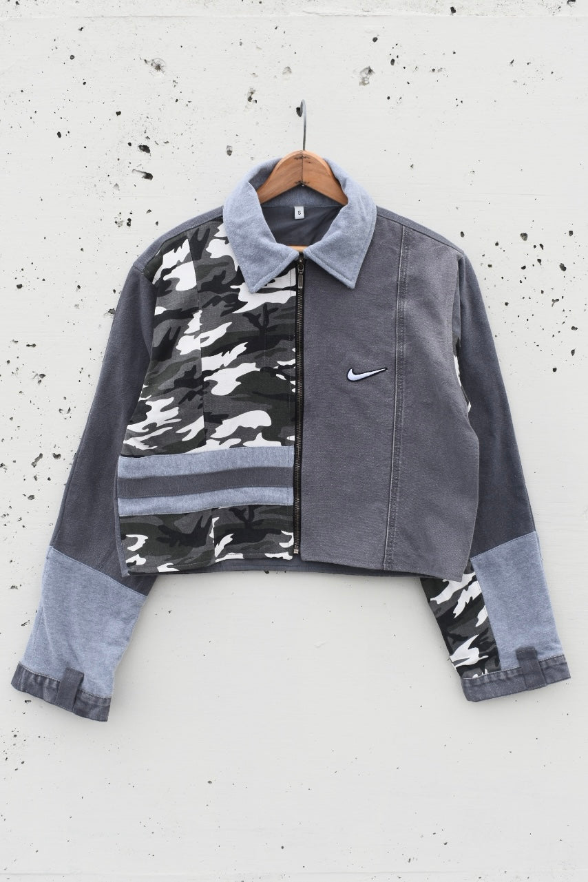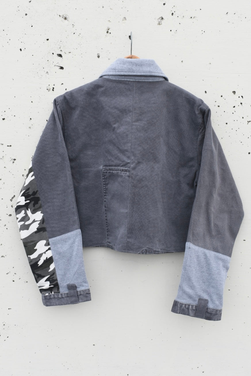 Gray and black reworked/upcycled cropped denim jacket