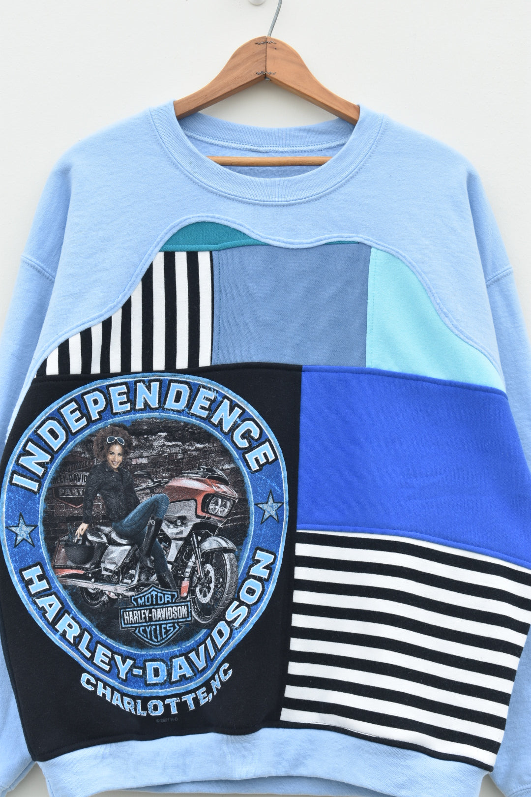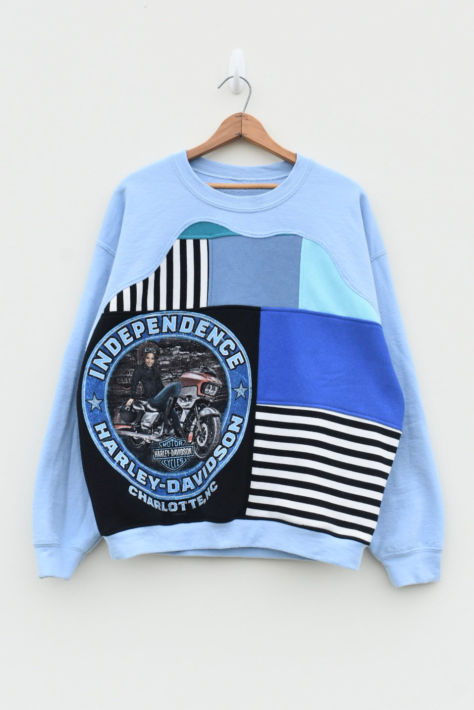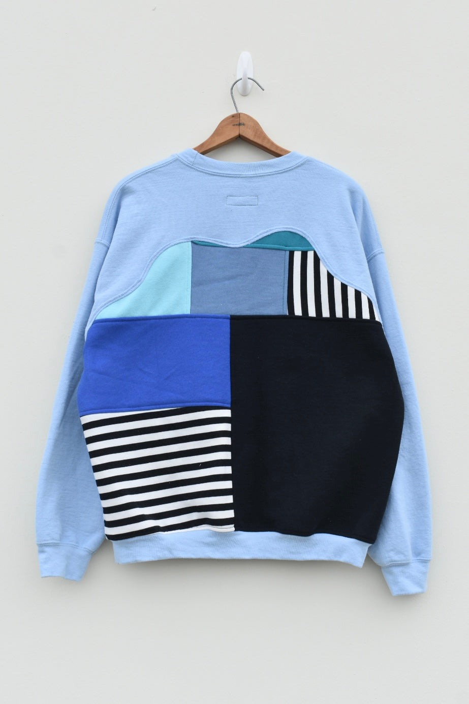 Blue, white and black striped reworked sweatshirt