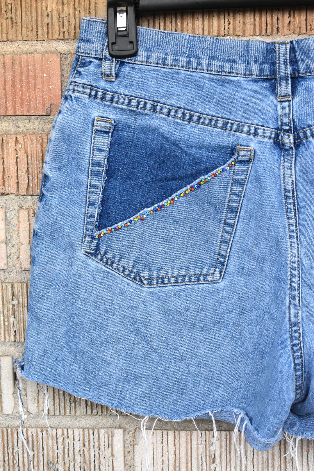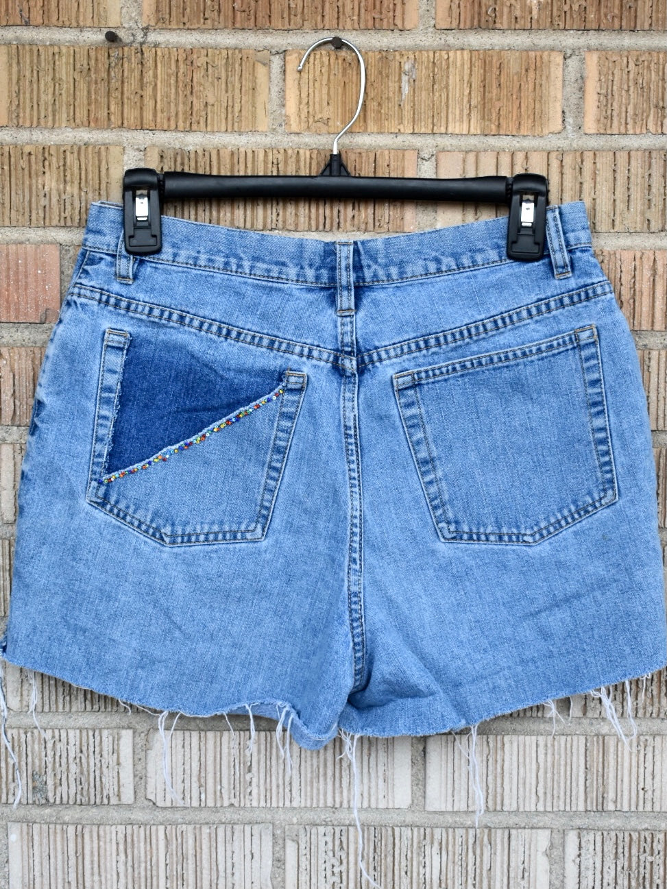 100% cotton, lightweight denim, great fit, hand beaded back pocket
