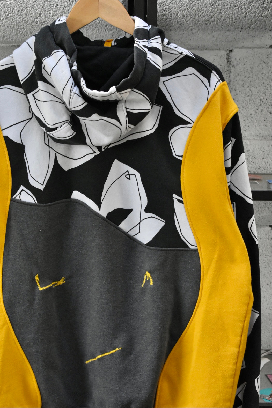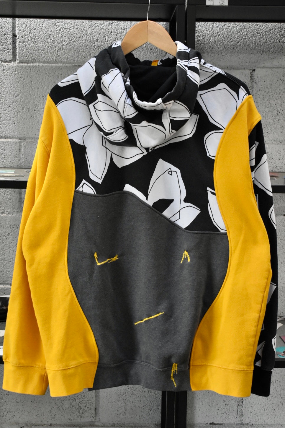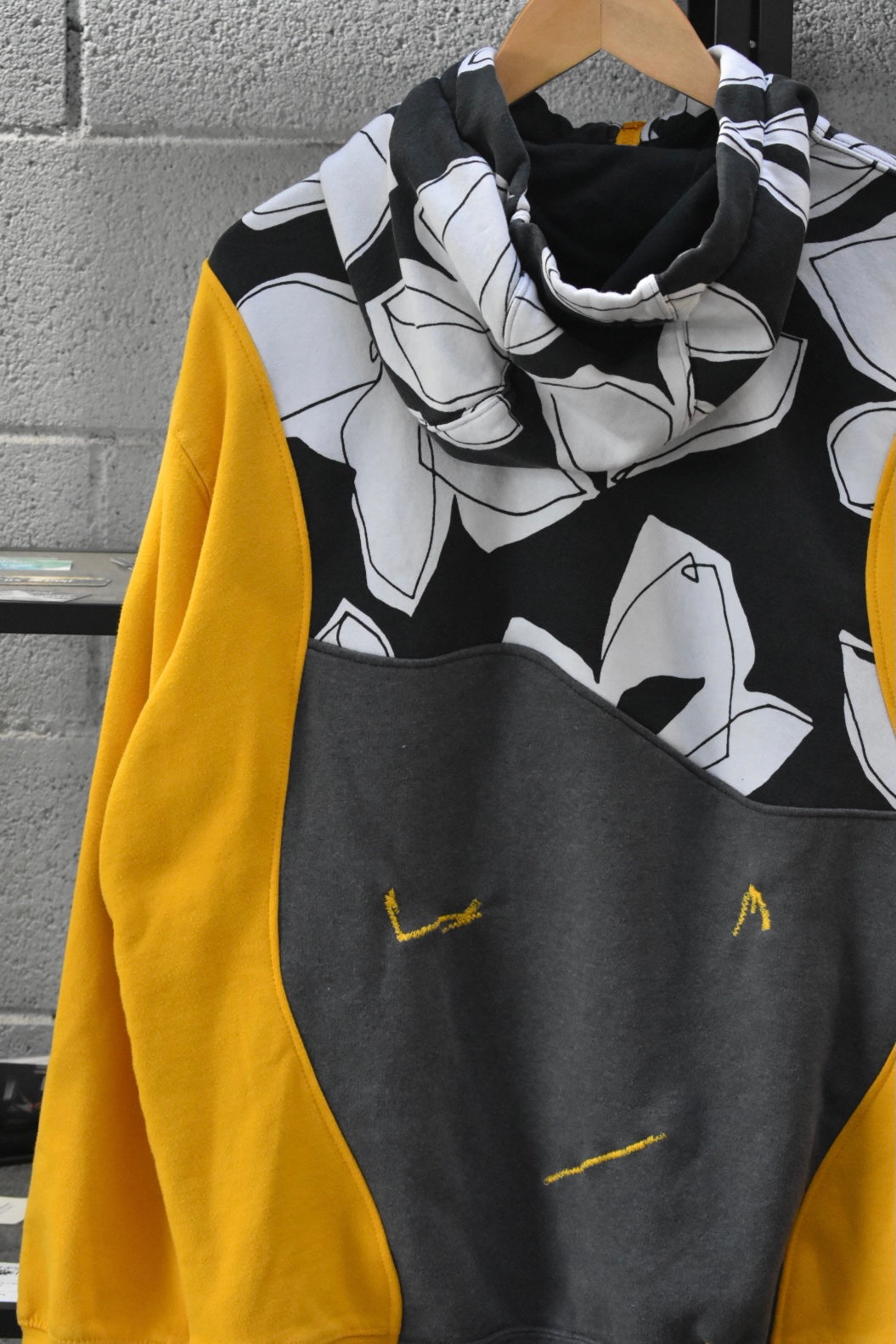 Goldfish Yellow, Dark Grey and Black & White Floral Designed Reworked Pullover Hoodie