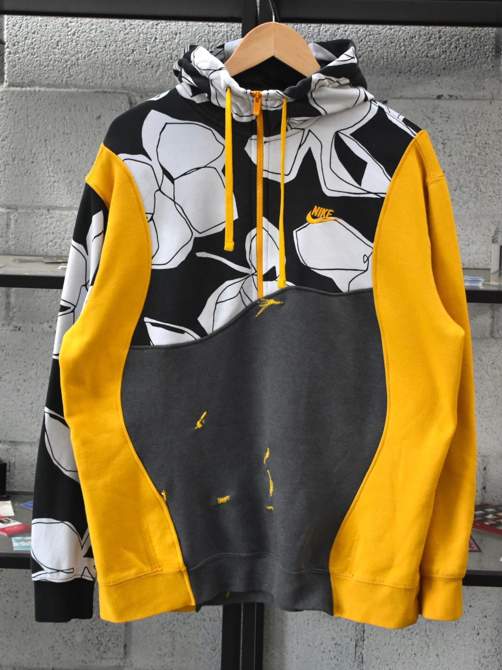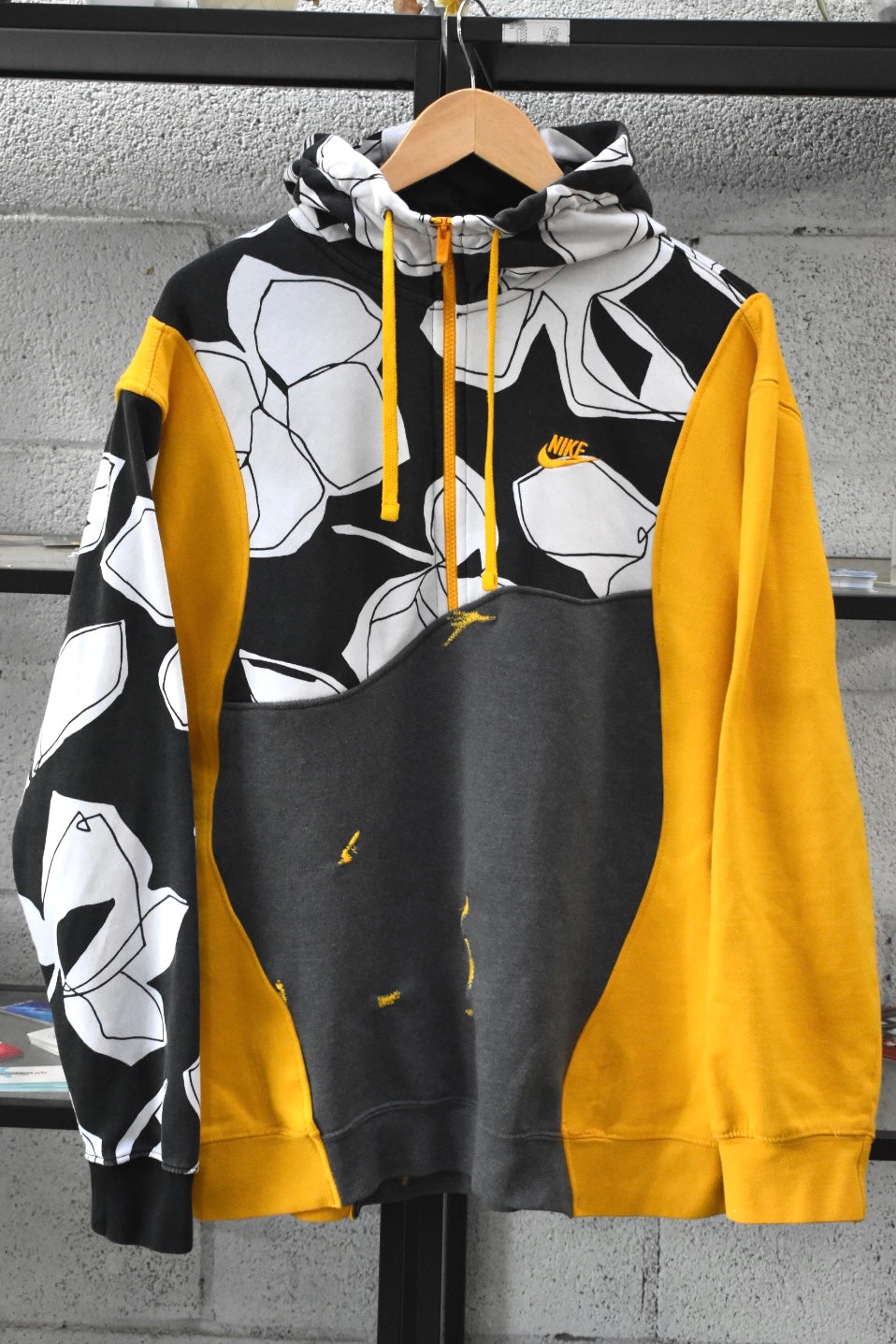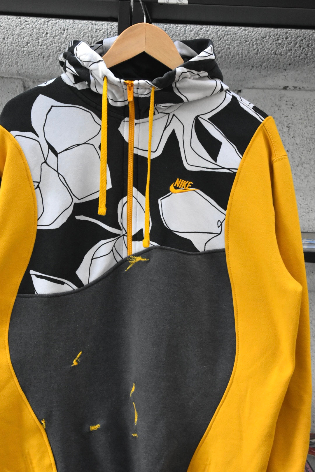 Goldfish Yellow, Dark Grey and Black & White Floral Designed Reworked Pullover Hoodie