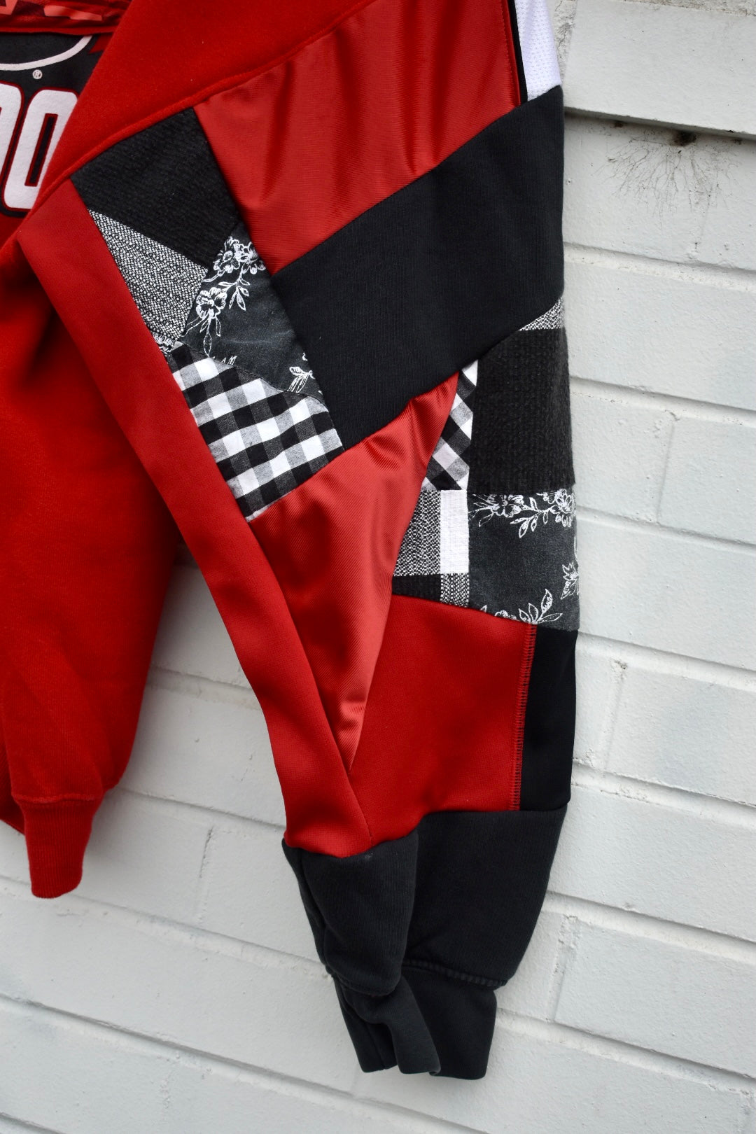 With logo on front. Patchwork left sleeve.