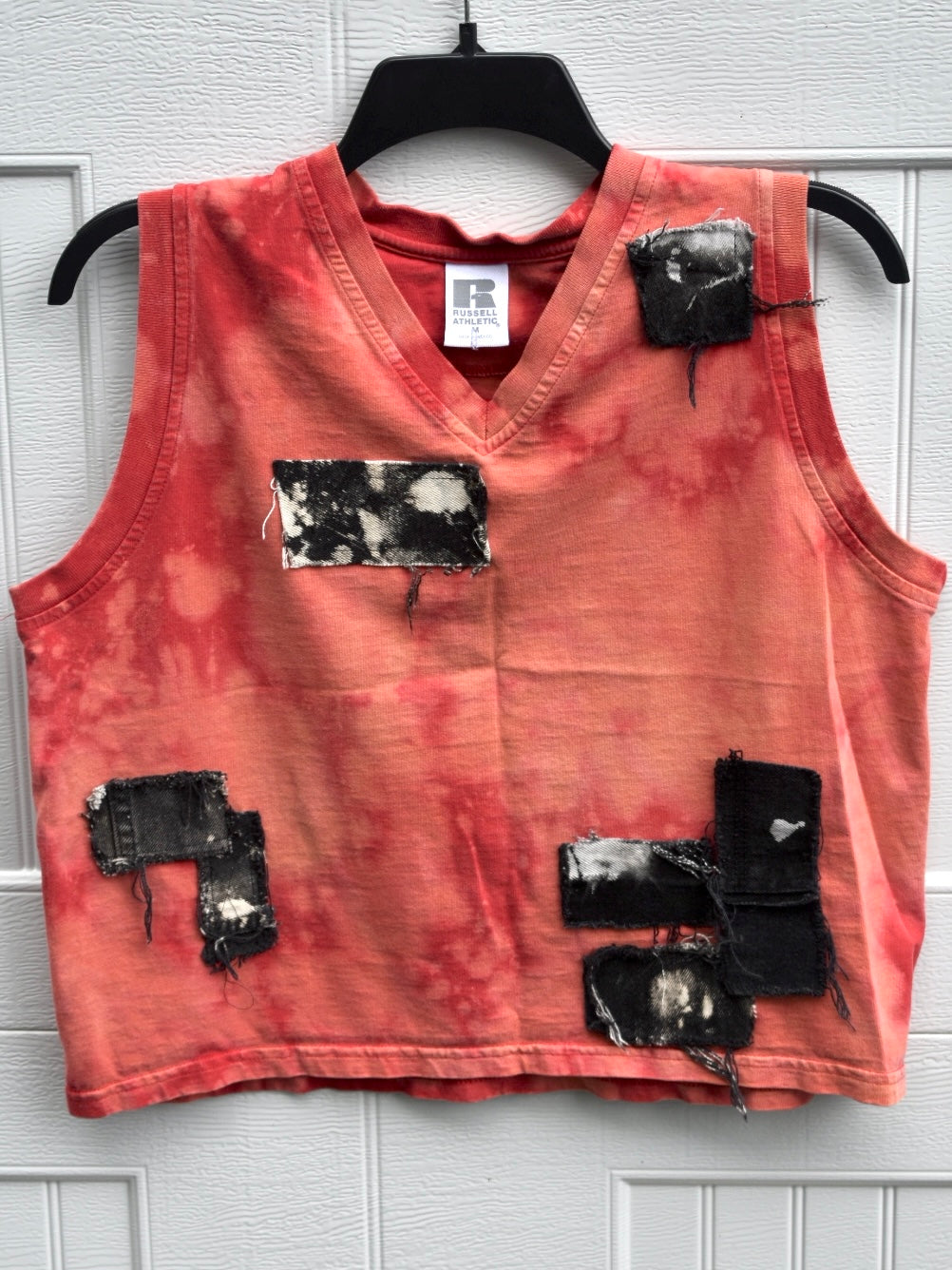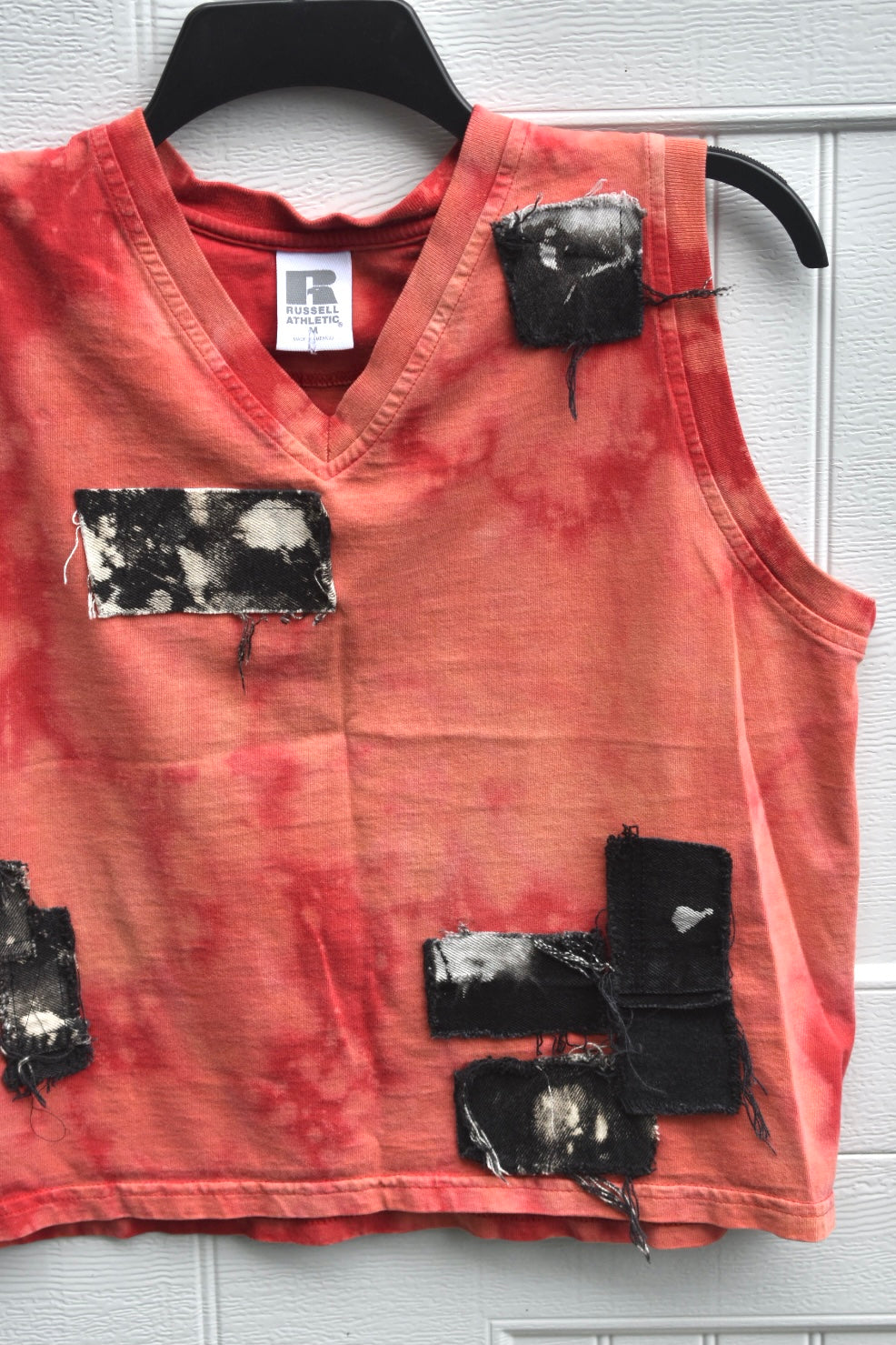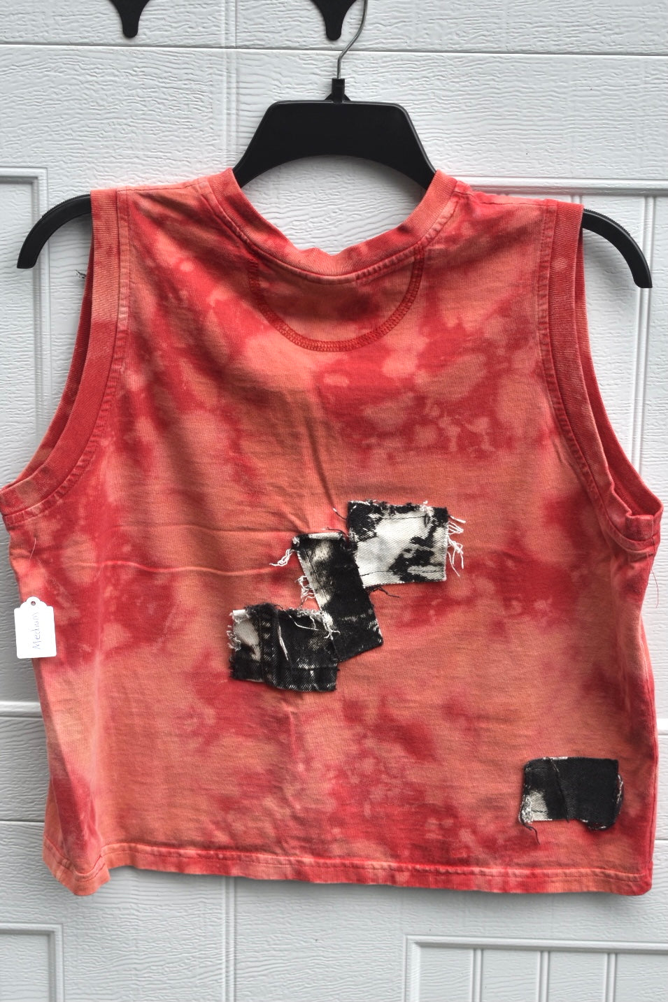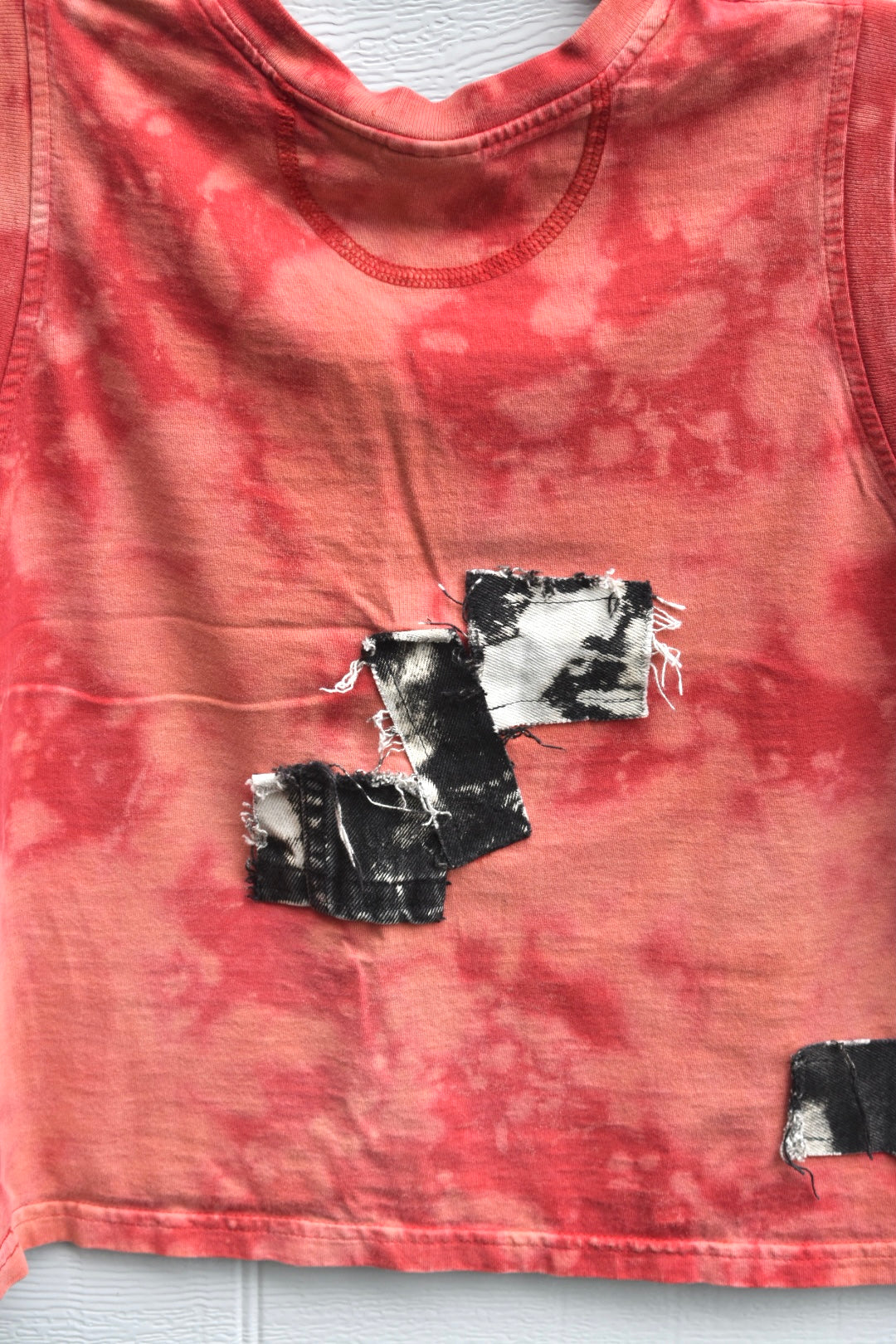 Red Reverse Dyed Cropped Tank with Denim Patches