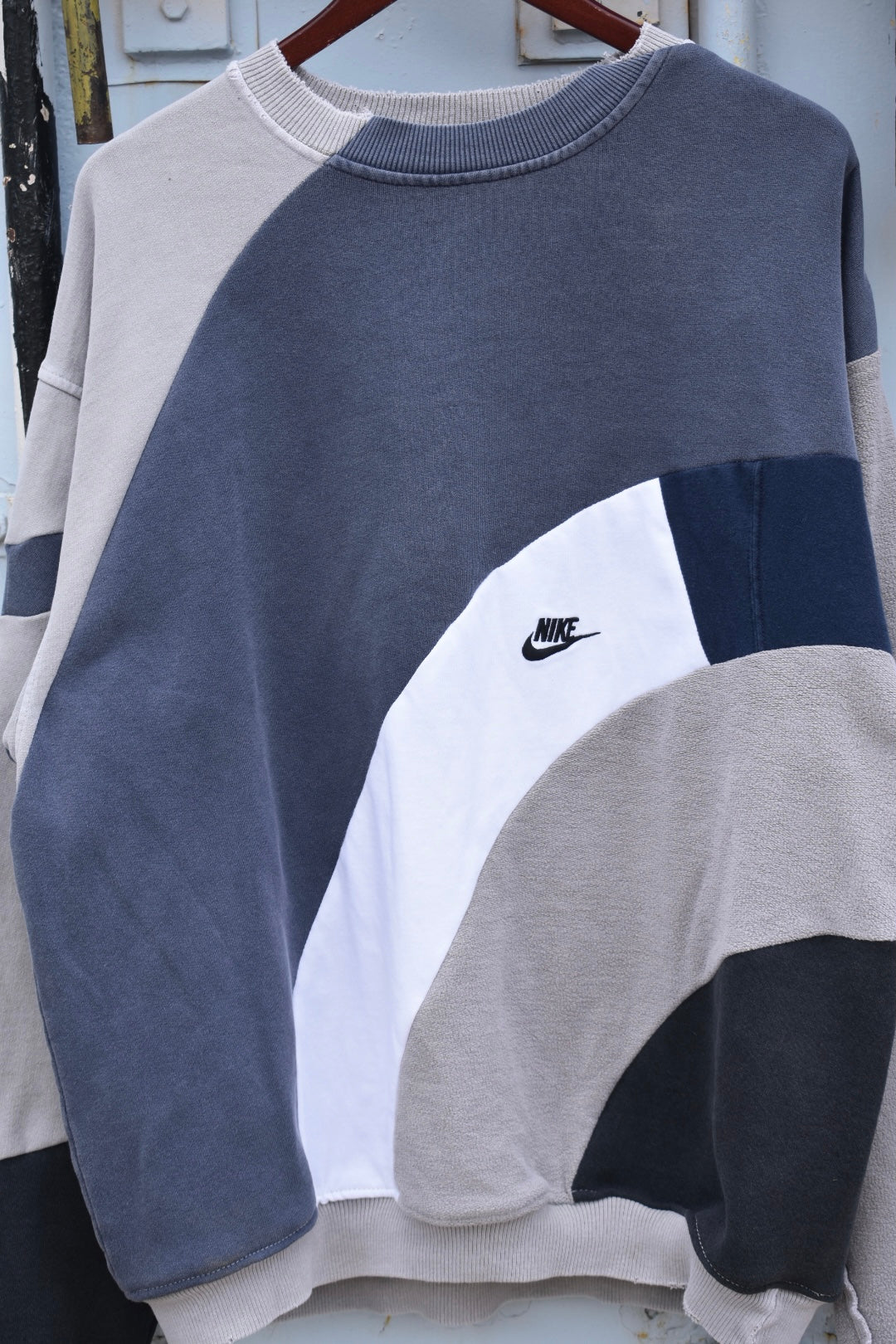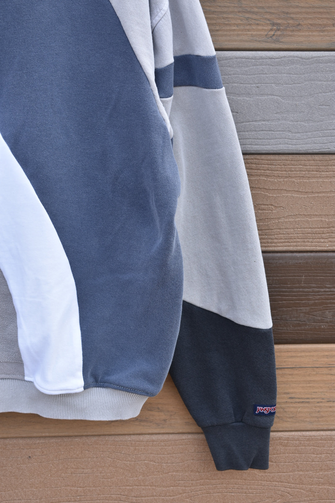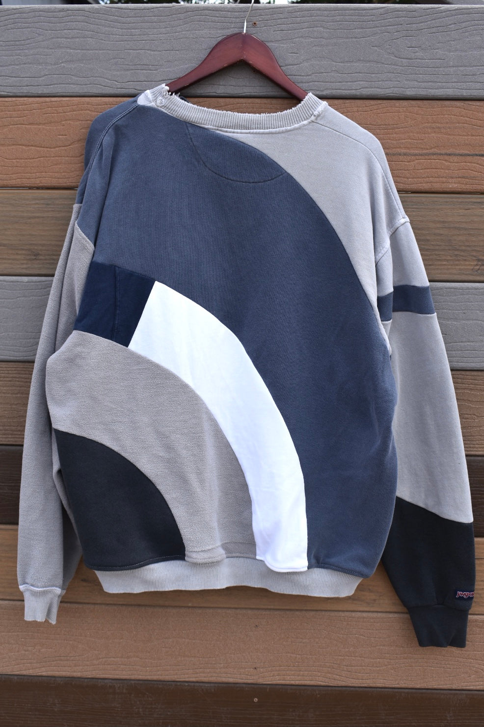 Blue, Dark Grey, Tan and White Reworked Pullover