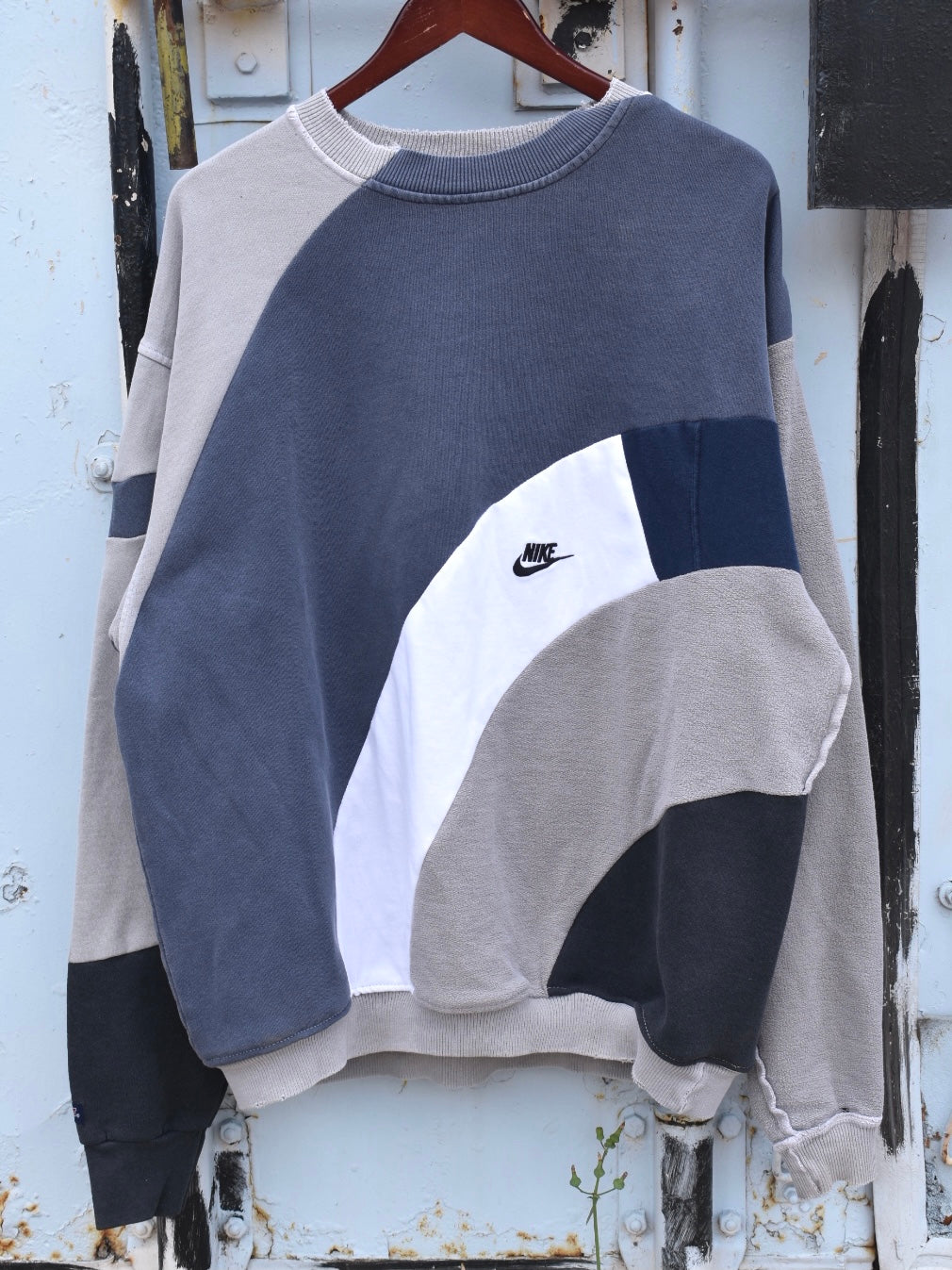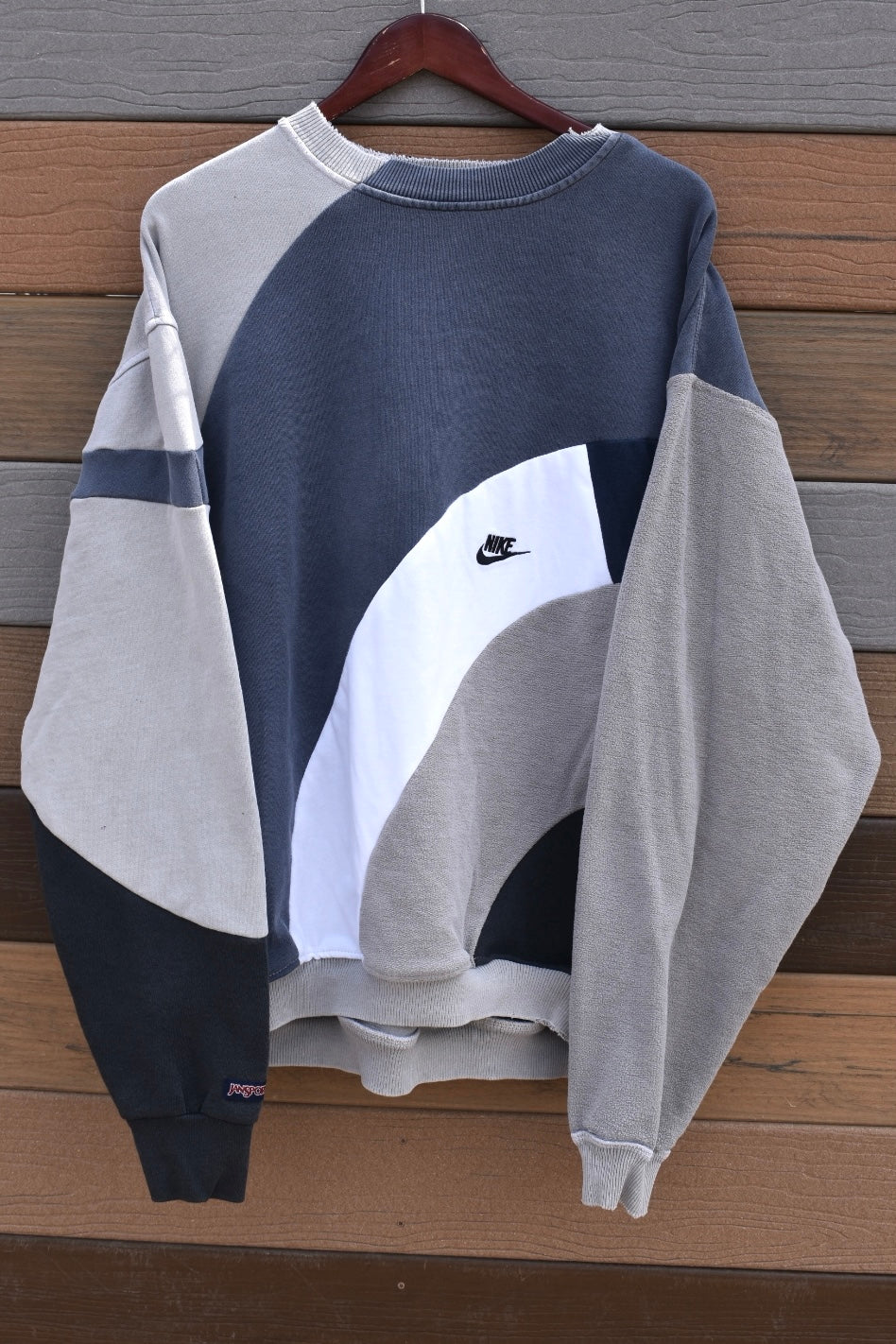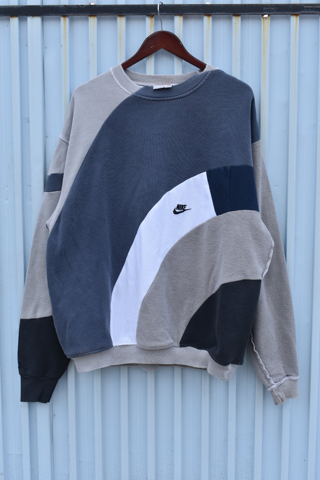 Blue, Dark Grey, Tan and White Reworked Pullover