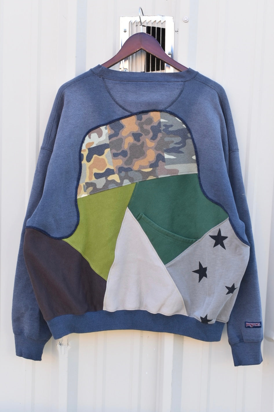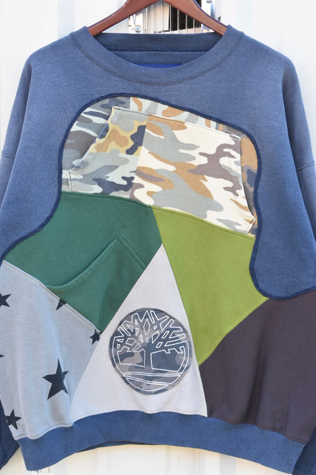 Faded Navy Blue, Green, Tan and Camo Reworked Pullover